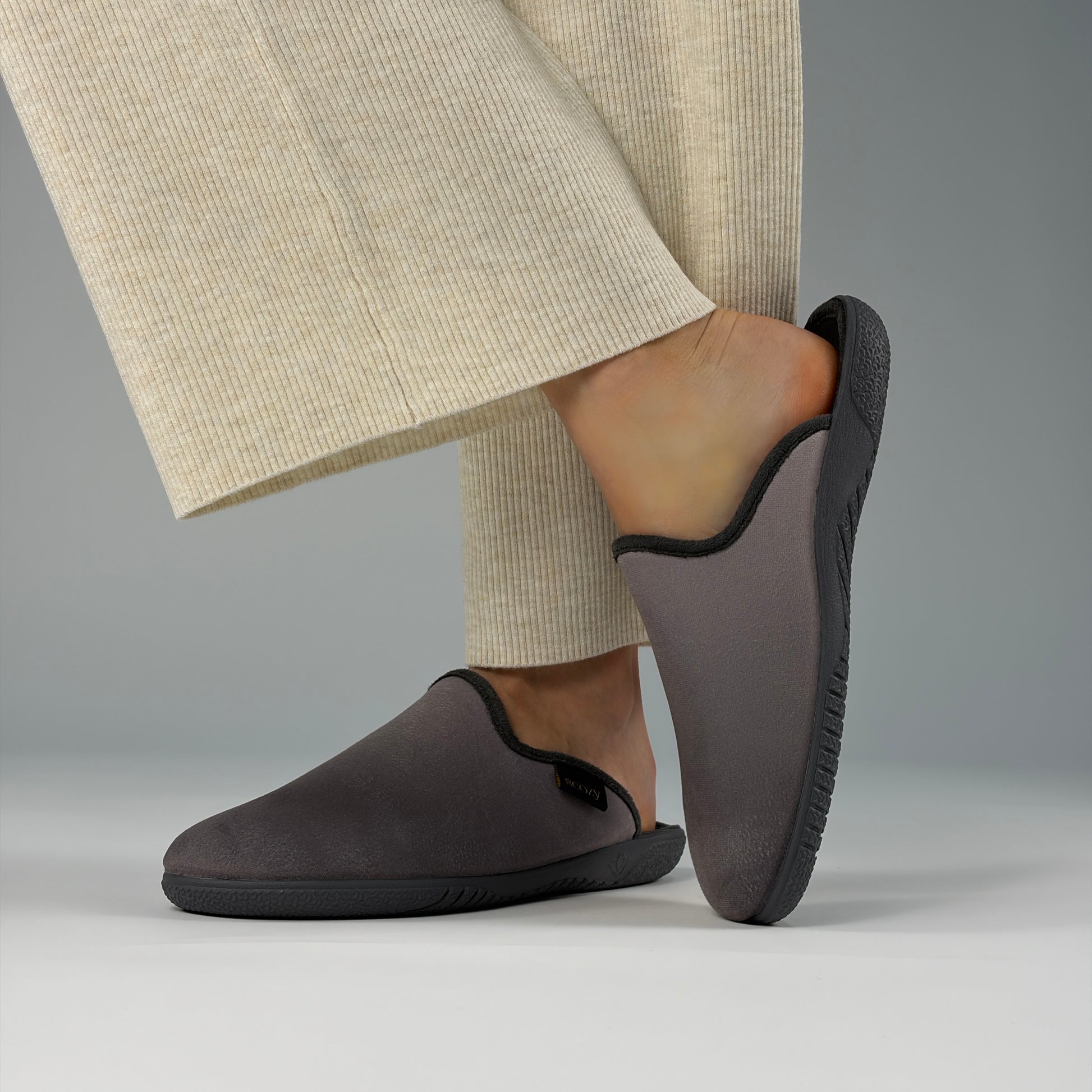 Die Laufsohle besteht aus einer widerstandsfähigen Naturkautschuk-Mischung – ein Symbol für Umweltbewusstsein und Qualitätsanspruch. Beim Öffnen des Schuhkartons begrüßt dich ein angenehm frischer Duft – dezent, unaufdringlich und Teil der Sohle selbst. Dank der wasserabweisenden Eigenschaft eignen sich die Hausschuhe auch für kurze Wege nach draußen – zum Briefkasten, in den Garten oder zum Bäcker. Die Konstruktion und das Gesamtgewicht bilden die perfekte Balance zwischen Halt und Leichtigkeit. Stell dir eine halb volle Tasse Tee vor – genau die richtige Temperatur, leicht genug, um fast zu vergessen, dass man sie trägt, und ein Gefühl von Gemütlichkeit.